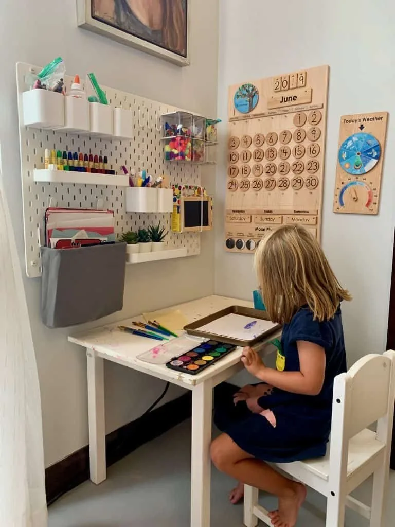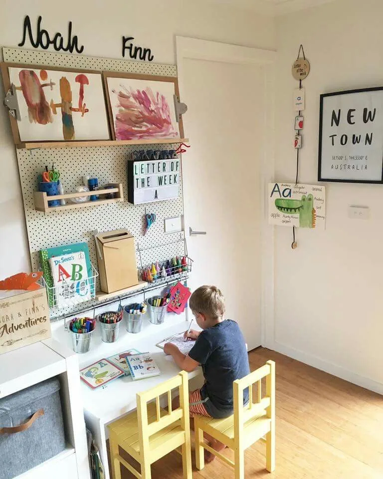 This is such a smart use of a small corner! We think the star of the show here is the pegboard—it keeps every single crayon, marker, and paper off the desk but still within easy reach. The wooden calendar is a wonderful, hands-on tool for teaching days and months. It’s a small space packed with great ideas!
