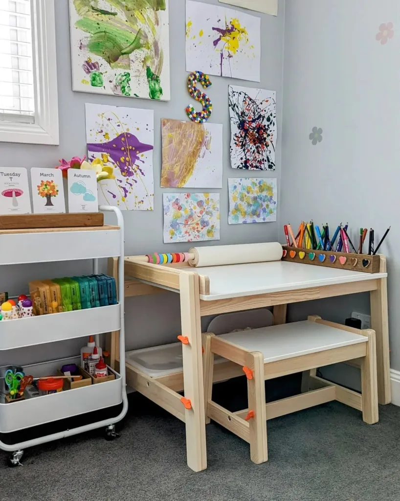 For the budding creative genius in your house, this setup is just perfect! We like how everything is dedicated to making art. The rolling cart keeps all the supplies neat and tidy, and that paper roll means there’s always a fresh canvas ready. A gallery wall to display their masterpieces is such a wonderful way to boost their confidence!