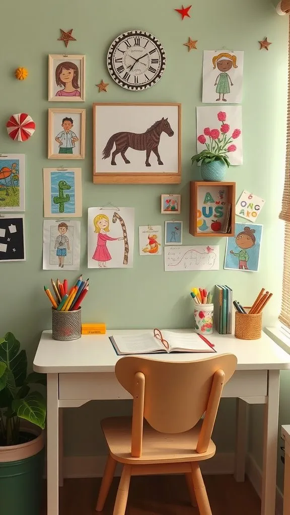 What a beautiful way to celebrate your child’s creativity! We love how this space uses the wall above the desk as a personal art gallery. Framing their work and putting it on display is the best motivation. The soft, minty green wall color makes the whole corner feel so fresh and inspiring.