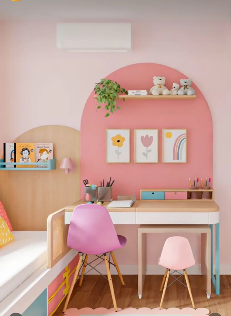 This is a homework station straight out of a design magazine! We are absolutely in love with the painted pink arch on the wall—it defines the space so beautifully and adds a huge “wow” factor. It’s proof that a kids’ study area can be incredibly chic and stylish.