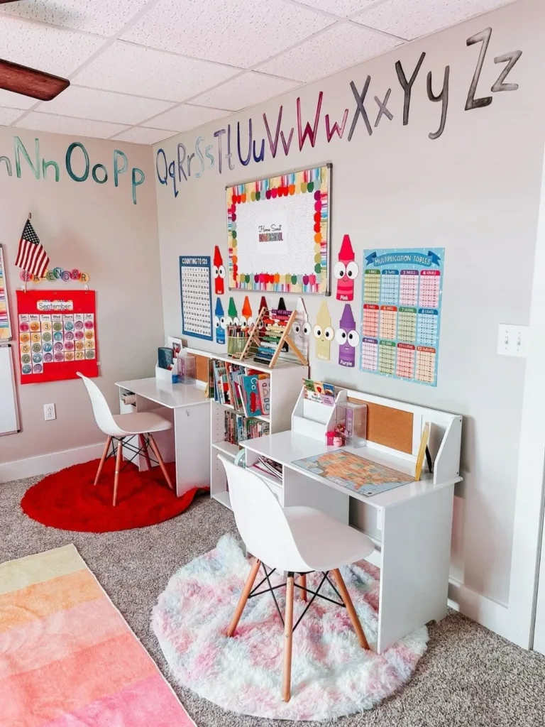 How fun is this! We love the bright, primary colors and all the educational posters that bring a playful “school” vibe right into your home. The individual desks and fluffy rugs create a special spot for each child. This setup makes learning look like the ultimate adventure!