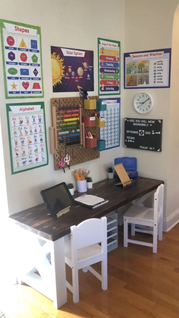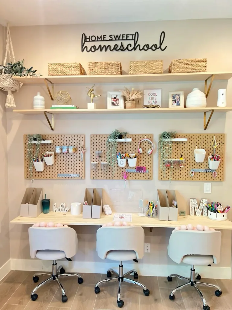Wow! We are just obsessed with this incredibly stylish and organized space for three. The individual pegboards are a genius way to give each child their own organized station. From the comfy chairs to the “Home Sweet Homeschool” sign, this setup proves that a study area can be both super functional and beautiful.