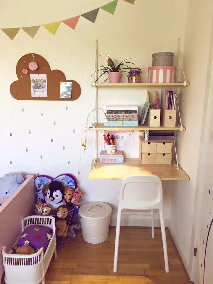 We just love the sweet and gentle vibe of this little desk. The soft pastel colors are so calming, and every little pencil and book has its own tidy spot. The cute decorations, like the bunting and the framed art, make it feel so personal and cheerful. It’s a clean, happy space for a creative mind!