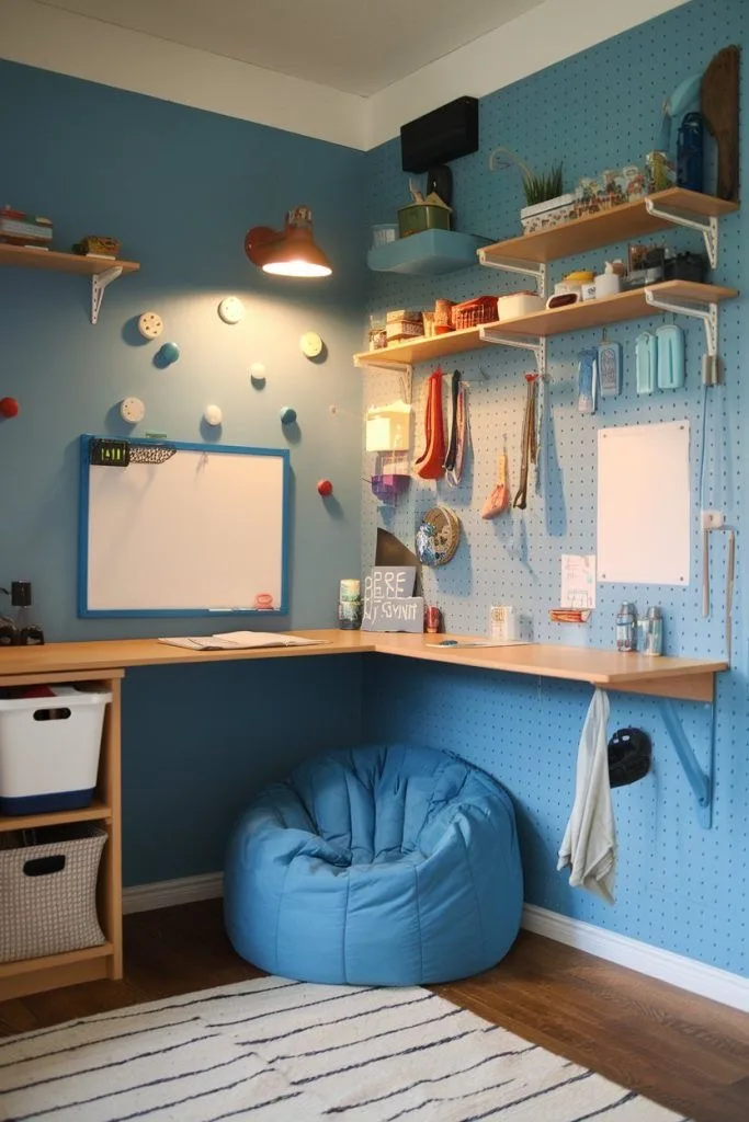 This is such a cool setup for a bigger kid! We think the wall-to-wall pegboard is an amazing way to keep everything organized and easily accessible. It’s a fantastic use of a corner space. Our favorite part? Swapping a regular chair for that super comfy beanbag for a more relaxed vibe – just make sure it’s still comfortable!