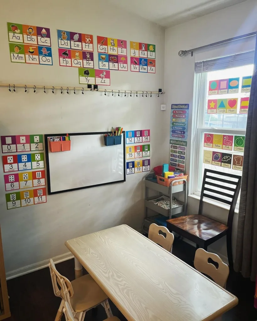 This is a fantastic setup for the littlest learners! Everything is perfectly at their level, from the low table to the hands-on learning charts. We like the use of a whiteboard for practice and the easily accessible cart for supplies. It creates a wonderful environment for playful discovery.
