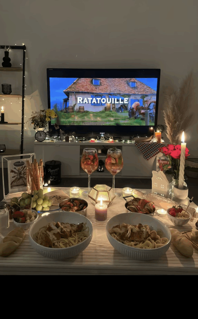 Choose a theme: classic romances, rom-coms, comfort movies from your childhood, or even a specific series. Build the snacks around the theme—popcorn in heart-shaped bowls, candy in your partner’s favorite flavors, or matching drinks.